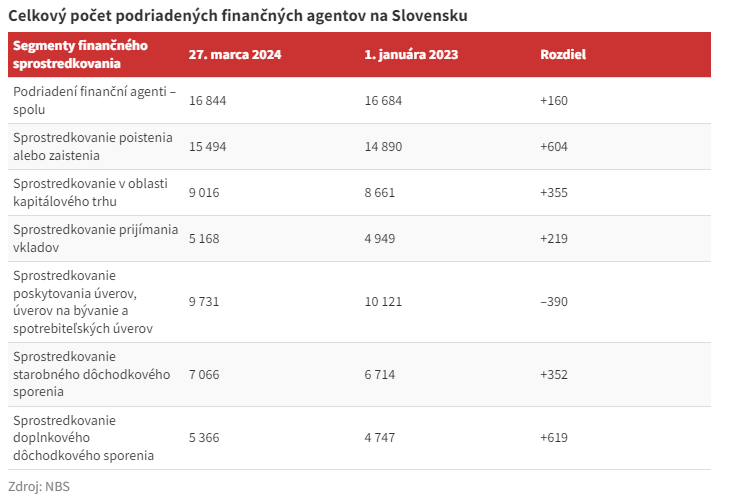 Počet podriadených finančných agentov na Slovensku zrejme čoskoro prekročí hranicu 17-tisíc. Svedčia o tom štatistiky Národnej banky Slovenska (NBS). Tie ukazujú, že počet agentov rastie vo všetkých sektoroch okrem úverov a hypoték, ktoré kvôli vysokým úrokovým sadzbám prežívajú „slabšie“ obdobie. Tento sektor v roku 2023 opustilo historicky najviac agentov.